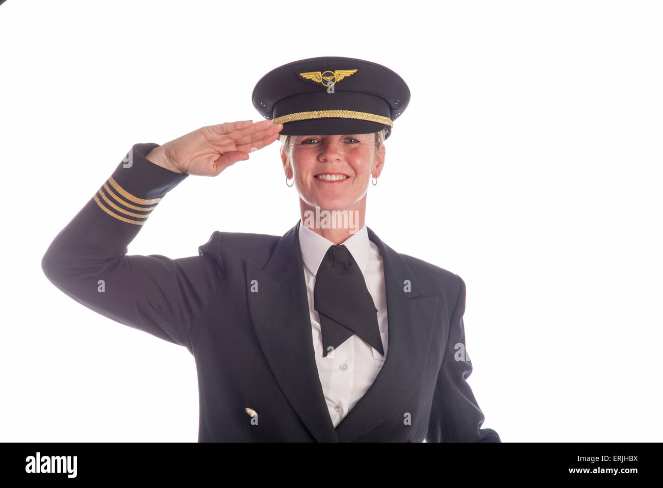 Hauts Femme Pilote De Ligne En Uniforme Saluting Banque D Images